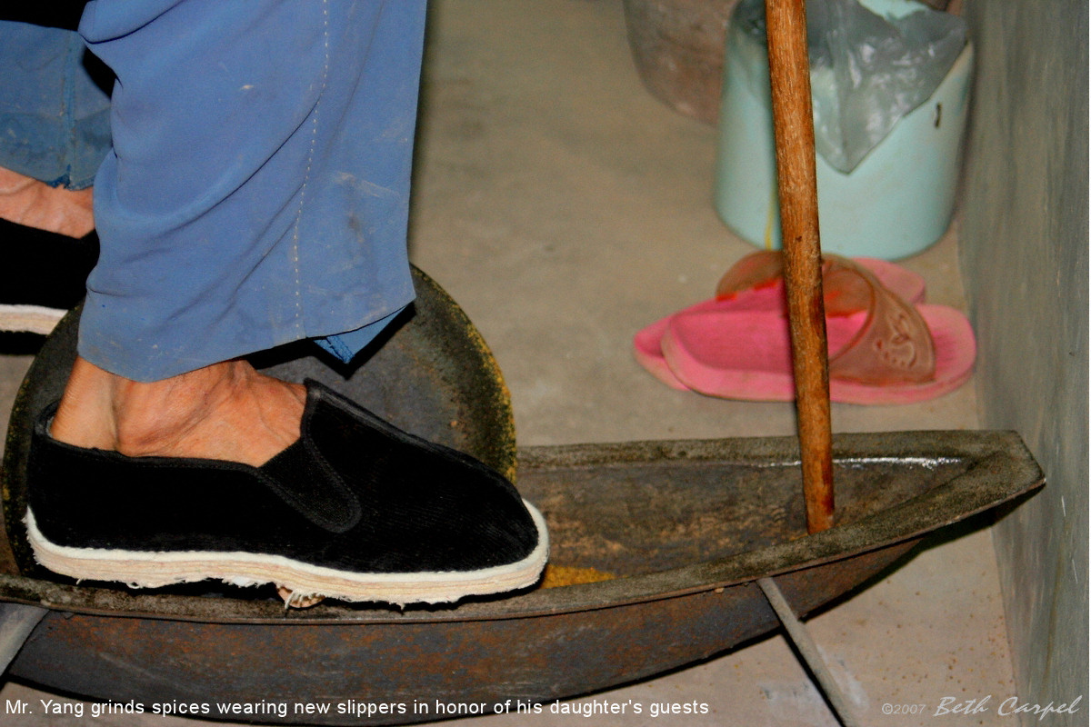 | Mr. Yang grinds spices wearing new slippers in honor of his daughter's guests, near Xi'an 5014 |